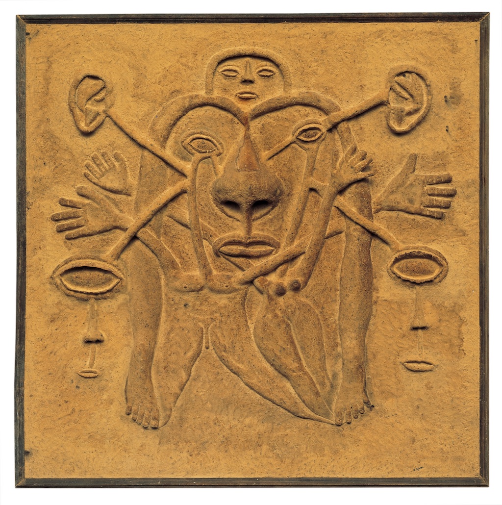 Byron's artmaking process combines ceramic with root sculpting and drawing or painting. The techniques of James Thomas, Juanita Rogers, Ralph Griffin, Bessie Harvey, and Jimmy Lee Sudduth are all present in Byron's reformulation of the metaphors of the earth. But Byron is not sculpting, nor is he painting. Painting's epistemology of a human mark upon a ground is almost antithetical to the Anatomy pieces, for example, with their implication of an autonomous geological volition creating their raised forms. Anatomy is the alluvial soil deposits of the muddy river, the post-deluge riverbank, stick and branch configurations on the forest floor, or the coffee grounds or tea leaves in the bottom of the drained cup as used in fortune-telling and divination. The process also connects with Byron's brick masonry. The paste cannot be applied in bulk or carved. It must be applied slowly in many layers while waiting for each patch to dry.