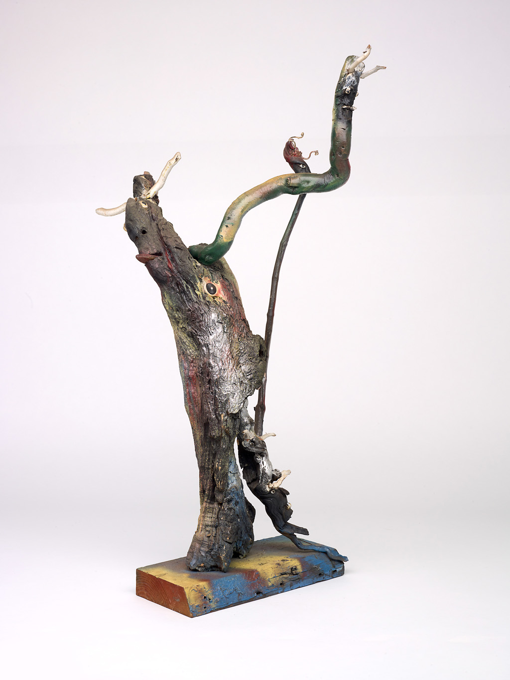 Found wood, jewelry, cowrie shells, paint, spray paint