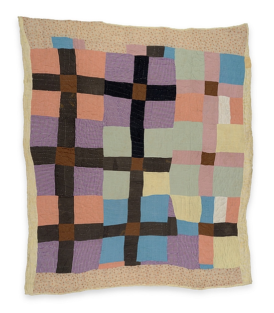 One of Deborah Pettway Young's older quilts, this work would be considerably less animated without subtle shifts in the alignments of the black crosses and the substitution of purple, orange, and blue for the black bands in three of the blocks. This quilt is also intriguing for its colors: characterized by the paler hues of older Gee's Bend textiles, it features unusual juxtapositions of lavender with orange and lime green.