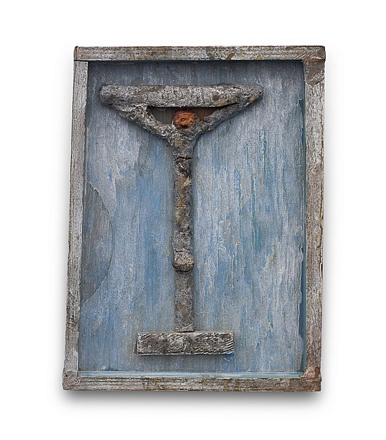 Wood, wood putty, plastic beads, and paint