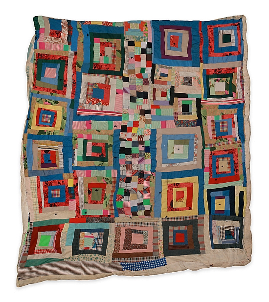 Along County Road 29, many women refer to any quilt dominated by concentric squares as a "Housetop," which reigns as the area's most favored "pattern." Its all-around simplicity hosts many experiments in formal reduction and, at the same time, offers a compositional flexibility unchallenged by other multipiece patterns. The "Housetop," from the composite block down to its constituent pieces, echoes the right angles of the quilt's borders, initiating visual exchanges between the work's edges and what is inside. Traditional African American "call and response," a ritual technique of music and religious worship, is intrinsic to the targetlike push and pull among elements. The feedback effects have mesmerized and inspired generations of Gee's Bend quiltmakers. Conceived broadly, the "Housetop" is an attitude, an approach toward form and construction. It begins with a medallion of solid cloth, or one of an endless number of pieced motifs, to anchor the quilt. After that, "Housetops" share the technique of joining rectangular strips of cloth so that the end of a strip's long side connects to one short side of a neighboring strip, eventually forming a kind of frame surrounding the central patch; increasingly larger frames or borders are added until a block is declared complete.