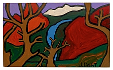 Light uses cruciform flowers and trees to symbolize temptations, often carnal temptation, but also as a preventive reminder of the beguiling words of preachers in pulpits. Light’s rivers, separating the material world (foreground) from the spiritual one (background), suggest baptism as a requisite to enter heaven; Light wants the rebirth without the ritual, and he wants the rebirth in the here and now, not as a shimmering reward available after the end of one’s mortal years. Joe Light, theologically, is not Jewish—he’s the first to concede that—he just does not subscribe to white man’s Christianity. Judaism has served an oppressed and persecuted minority, and Light can relate to that.
