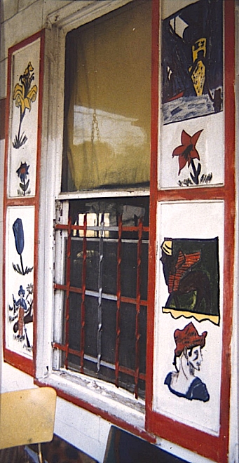 The front porch and yard of Light’s house are “aimed” at the community. This is the domain of Joe Light the social critic, spokesman and evangelist for minority races and religions. There are (or were—he painted them over after two decades) autobiographical, cartoon like images on his shutters, across the façade of his house: a boat with a rope tethering it to a pole; an insect extracting nourishment from a flower; a country bumpkin holding a dead rabbit; a hobo with the obligatory knapsack. Aimed solely at himself, their messages are as follows: don’t be a drifter, take care of your health, do what you must to provide for your family, and go to any length to seek enlightenment.