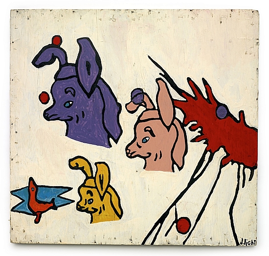 As compared with the American art-historical movement of the 1960s, Light's particular brand of pop art is unexpectedly sober and serious. Light never pokes fun at the tacky side of American society. He has no artistic or cultural mandate to reconcile it with so-called high art. He never uses art to make an ironic point about material culture. He loves the form of a commercial bottle and a hubcap, and the face of a hero. Low art's dominant images are icons for those without access to the world of high art. The only connections Light has with the world of high art are its remnants that have made their ways to the flea markets, or those that have come to him diminished by the limitations of his TV screen. He fashions a religion from this high-to-low fusion. He redeems the bric-a-brac, honors it, and makes it respectable, even holy. And in so doing he devises a universal theology according to Joe Light, with large illustrations (often four feet by eight feet), that guide the viewer toward enlightenment and salvation.