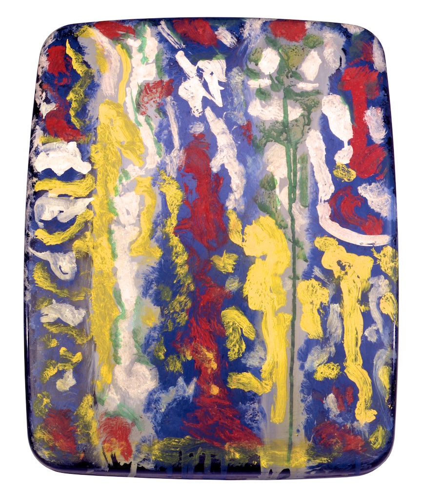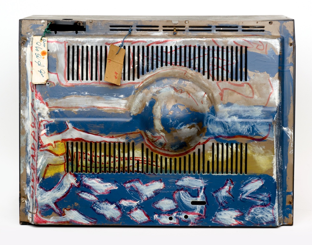 A related piece from the same period (around 1980) is an enameled stovetop whose surface is painted in a style similar to the paintings on the television set and the windshield. Murray had a special fascination with stovetops, and painted several of them. Perhaps it was their association with heat and energy that made them an appropriate subject for him, or perhaps their combination of geometric elements appealed to Murray’s vocabulary of forms. The stovetop is another in his series of occluded portals, but with clear additional implications. As with the other shields, blue guardian forms supported by a divine yellow energy field cover the solid surface. But the stovetop has inherent weaknesses–four circular burner openings–through which evil can enter. Murray fastened a piece of plywood across the back of the object, blocking the openings but failing to close them tightly enough to make them secure. Murray drew attention to this flaw by smearing red in and around two of the holes. The device has failed. Exercise more diligence in defending against threatening forces, Murray seems to have been reminding himself. Over and over, using a wide variety of objects, Murray reenacted his ritual. He understood that evil cannot be stopped, but each reenactment is reinforcement.