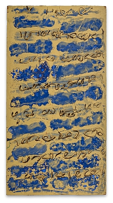 Murray’s use of colors constituted a consistent, codified system that applied to his entire body of earlier work and to most of the later pieces. Three primary colors—yellow, blue, and red—had specific symbolic duties: red represented torment or evil—evil people, evil spirits, evil forces; conversely, blue represented positive strength or good; yellow indicted a divine presence, an energy emanating from or embodied in the sun. White (often) and black (occasionally) were added to his three basic colors. White connoted a spiritual purity related to death or the afterlife. White as a representation of otherworldliness is traditional in many places—as close to Murray as the white tombstones in a nearby graveyard and as far away as ritual funerary sculpture in Nigeria and Congo, two areas that were principal sources of African brought to the South Georgia coast. (The rock/concrete/porcelain assemblages in Murray’s yard consist of white components symbolizing perhaps the positive, and by extension supportive, nature of the ancestors.) Black, when introduced into, onto and around white, blue and yellow forms, denotes imperfection or impurity—a transitional state between the thoroughly opposed red and blue energies. When Murray was later supplied with paper and pigments that did not conform to his system of colors, he introduced them into his code, locating the closest, readiest substitute for each elemental color. When the combinations available to him seemed too distantly removed from his zymology, he strayed from his schematic narratives and created abstractions, some of them neatly ordered, most of them heavy with calligraphic notation.