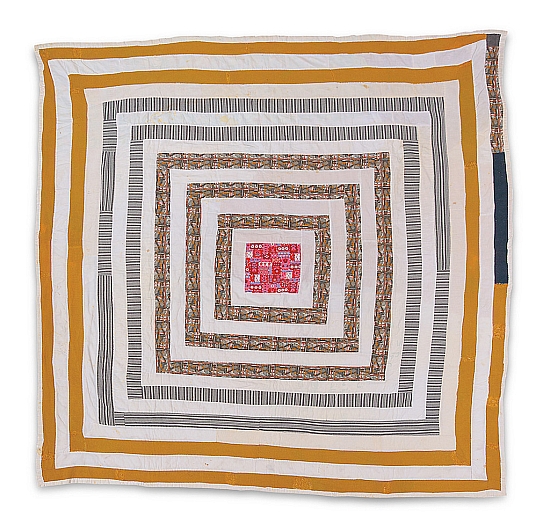 Along County Road 29, many women refer to any quilt dominated by concentric squares as a "Housetop," which reigns as the area's most favored "pattern." Its all-around simplicity hosts many experiments in formal reduction and, at the same time, offers a compositional flexibility unchallenged by other multipiece patterns. The "Housetop," from the composite block down to its constituent pieces, echoes the right angles of the quilt's borders, initiating visual exchanges between the work's edges and what is inside. Traditional African American "call and response," a ritual technique of music and religious worship, is intrinsic to the targetlike push and pull among elements. The feedback effects have mesmerized and inspired generations of Gee's Bend quiltmakers. Conceived broadly, the "Housetop" is an attitude, an approach toward form and construction. It begins with a medallion of solid cloth, or one of an endless number of pieced motifs, to anchor the quilt. After that, "Housetops" share the technique of joining rectangular strips of cloth so that the end of a strip's long side connects to one short side of a neighboring strip, eventually forming a kind of frame surrounding the central patch; increasingly larger frames or borders are added until a block is declared complete.