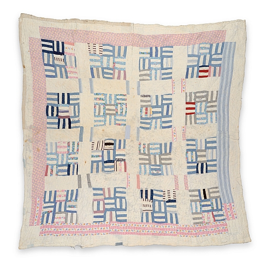 Two of Malissia's quilts show a pronounced variation on the strip technique. In one, dating from about 1950, the strips form an animated pattern of alternating columns of solids and irregular stripes. In this older and more intricate of the two, a quilt dating from the 1940s, the strips are made into small squares that are then assembled in blocks to form a "Basket Weave" variation of the "Nine Patch" pattern. The blocks are set with sashing and cornerstones. These quilting patterns have become pervasive in Gee's Bend culture: a boarded-up window at Tinnie Dell's store was for a time decorated in a "Nine Patch" pattern.
