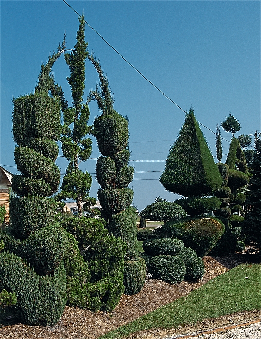 "This part of the hedgerow border has a Hollywood juniper in the center between two upright-growing junipers, and a Leyland cypress in the shape of a pyramid."