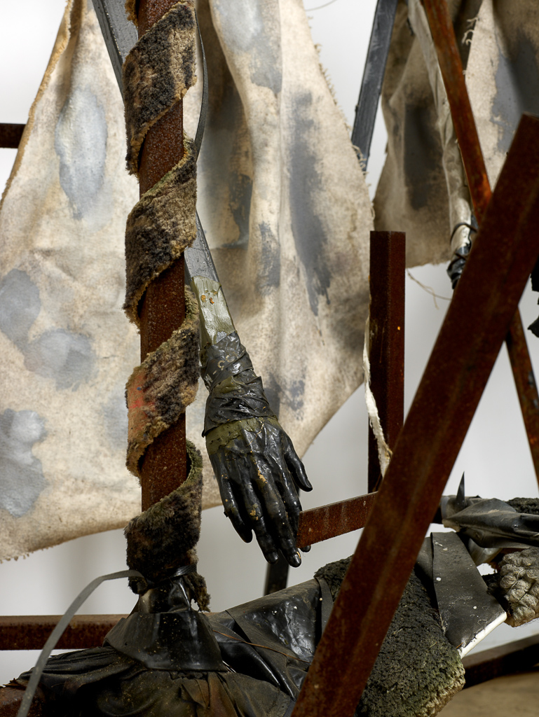 At the end of October 2001, a little over a month after the 9/11 attack, Dial happened to make one of his rare visits to New York and stayed at a hotel just a block or two away from Ground Zero. Over the next year, he created several works inspired by that visit. In the end, he ultimately fashioned over a dozen pieces on the disaster. In the major sculptural work Crosses to Bear (Armageddon), Dial captures the aftermath of the catastrophe. Made between 2001 and 2004, it is a vision of the world in shambles, the metaphoric remnants of 110 stories of collapsed concrete and steel. Within its skeleton of bent, rusty metal are hanging pieces of shredded tire that resemble burnt flesh. For Dial, these two materials—steel and rubber—represent resources crucial to the livelihood of the nation, now turned to rubble. Parts of the assemblage are wrapped in red-stained cloth, dressings on a wounded humanity, a symbolic attempt to mend bodies and souls ravaged by violence and aggression. Martyrdom, suffering, and ultimately salvation are also reflected in the line of metal crosses that rise hauntingly out of the ruins.